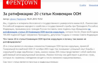 «Мы, студенты и аспиранты Московского государственного университета имени М.В. Ломоносова и Российской академии народного хозяйства и государственной службы при Президенте Российской Федерации, призываем всех граждан России поставить свою подпись под обращением за ратификацию статьи 20 Конвенции ООН против коррупции, которое после сбора необходимых 100.000 подписей будет направлено Президенту, депутатам Госдумы и членам Совета Федерации.