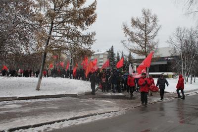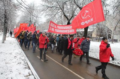 Колонна демонстрантов с красными флагами, алыми шарами и траспарантами, двигалась благодаря нашим молодым музыкантам, с особым настроением. Под звуки оркестра к памятнику В.И Ленина , была возложена прекрасная корзина цветов. Гимн России, который участники митинга воспринимали как гимн Советского Союза, был профессионально исполнен музыкантами. По традиции митинг начался с вручения партийных и комсомольских билетов, почетных грамот и подарков именинникам.На митинге выступили первый секретарь БРО ПП КПРФ Ю.Г. Кутлугужин, заместитель председателя фракции КПРФ Совета Городского округа г. Уфа, первый секретарь Калининского РК КПРФ Р.Ф Хафизов, председатель Совета рабочих г.Уфы И.Ф. Закиров, первый секретарь республиканского Комитета ЛКСМ Ян Двинский , председатель профсоюза "Курай" Р.З Тухватуллин ,координатор движения "Помощь Донбассу" А.М.Скакалин.