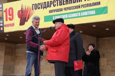 Вел митинг первый секретарь Черкесского горкома КПРФ, депутат Народного Собрания (Парламента) КЧР С.Ф. Ласков. Среди выступающих член ЦК КПРФ, депутат Народного Собрания (Парламента) КЧР, первый секретарь Карачаево-Черкесского республиканского комитета КПРФ И.А-Г. Биджев, член ЦК ЛКСМ РФ, секретарь рескома КПРФ К.К. Бытдаев, представители дальнобойщиков В.В. Каминский и Климин В.А., депутат Народного Собрания (Парламента) КЧР, председатель регионального отделения Всероссийского женского союза «Надежда России» М.А. Михайлович, ветераны Л.Н. Комарова, Ю.М. Гожев, А.Ф. Валов.