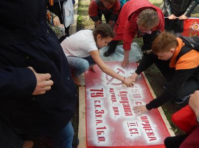 Также все желающие могли изготовить своими руками копии Знамени Победы. Приобщиться к истории при помощи баллончиков с краской и красной ткани образовалась целая очередь. Большинство из них - учащиеся младших классов.