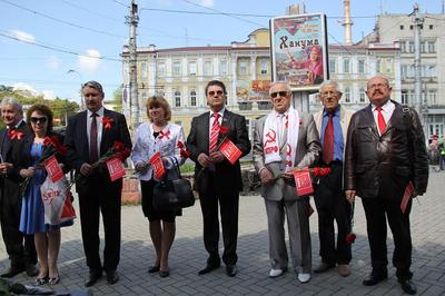 На площади Советской от имени участников демонстрации руководители Республиканской, Симферопольского городского и Симферопольского районного отделений КПРФ возложили цветы к памятнику «Выстрел в спину», погибшим от рук ОУН-УПА.
