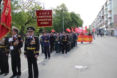 В колонне шли представители трудовых коллективов города, учащиеся ВУЗов, Союз Советских офицеров Крыма, представители Крымской общественной организации инвалидов войны, Вооруженных Сил, участников боевых действий, Комсомол и Пионерия города, общественные организации. Они несли в руках транспаранты «Народным предприятиям быть!», «Нет превращения земли в товар!», «Куда дели Симферопольский Молокозавод?!», «Союзу братских народов быть!», «Даешь правительство народного доверия!», «Экономическую программу КПРФ в жизнь!», «Вернем страну народу!», «Коль достал тебя буржуй — выходи и протестуй!» и другие.