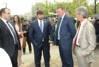 На празднования по приглашению правительства Донецкой Народной Республики также прибыли председатель Совета министров Луганской Народной Республики Геннадий Цыпкалов и Председатель Парламента Республики Южная Осетия Анатолий Бибилов».