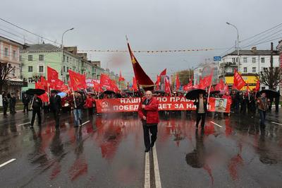 1 Мая в городеРязани под знамёнами КПРФ, ЛКСМ РФ, «Дети войны», ВЖС «Надежда России», «Русский лад» по центральной улице — Первомайскому проспекту прошла красная колонна под лозунгами: "Правительство – в отставку!", «Требуем хороших дорог!», "Нет - платному образованию!", "Нет - разграблению муниципальной собственности!". Возглавляла её молодёжная группа с транспарантом "Наше дело правое! Победа будет за нами!", которая скандировала по ходу движения: "Ленин! Партия! Комсомол!", "Наша Родина – СССР!".