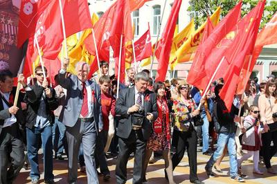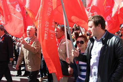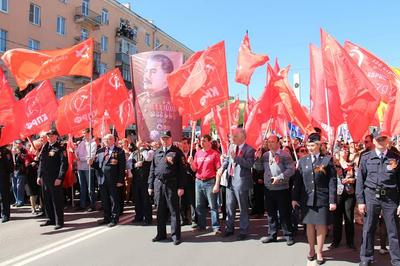 Под красные знамёна встали тысячи жителей города. По ходу колонны звучали советские и военные песни, участники скандировали коммунистические и патриотические лозунги.