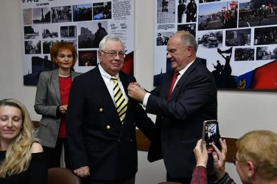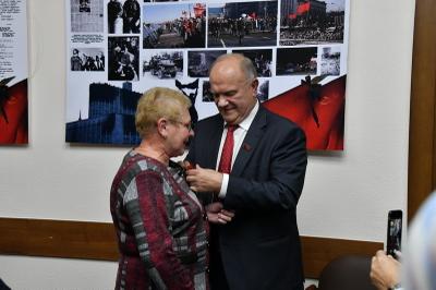 В завершении мероприятия лидер КПРФ наградил группу ветеранов комсомола памятной медалью ЦК КПРФ к 100-летию Ленинского Комсомола.