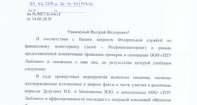 Директор Росфинмониторинга Юрий Чиханчин сообщил, что по запросу Рашкина была проведена проверка, которой «В ходе проверочных мероприятий выявлены сведения», частично подтверждающие изложенные в запросе факты в части участия в различные периоды Дудулина П.Е. и Матюшкина П.Ю. в деятельности ООО «ТПУ Люблино» и аффилированности последнего с кипрской компанией «Фринеом Лимитед», – сообщил Росфинмониторинг. Результаты проверки были переданы в Следственный комитет.