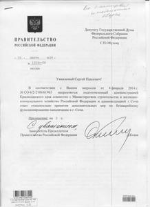 Д. Козак направил депутату информацию, подготовленную администрацией Краснодарского края совместно с министерством строительства и жилищно-коммунального хозяйства РФ и администрацией г. Сочи.