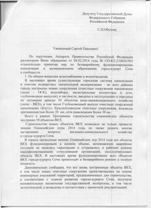 На имя депутата ГД от Краснодарского края (фракция КПРФ) С.П. Обухова пришло письмо от заместителя председателя правительства РФ Д. Козака. Ранее депутат запрашивал информацию о принятых мерах по безаварийному функционированию канализации в г. Сочи.