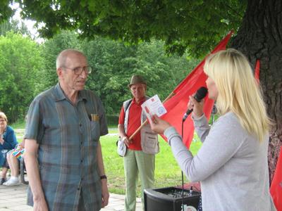 За любовь к жизни, причём к жизни честной, справедливой, прямо на акции был награждён медалью «90 лет СССР» ветеран партии П.В. Баданин. Павлу Васильевичу недавно исполнилось 80 лет, но он продолжает активно агитировать людей за социализм, раздавать партийные газеты. Также в этой торжественной части мероприятия был вручен партийный билет Б.В.Алексееву. После этого коммунист В.И.Чемакин выразил надежду на общественно-политические перемены в стране словами А.С.Пушкина:
