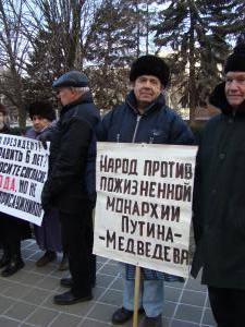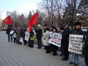 18 декабря 2008 года в 10-00в конференц-зале Администрации Ростовской области открылось 10-е заседание Законодательного Собрания области четвертого созыва. В повестке дня, которого значились, в том числе следующие вопросы: О Законе Российской Федерации о поправке к Конституции Российской Федерации «Об изменении срока полномочий Президента Российской Федерации и Государственной Думы», проект закона «О внесении изменений в Областной закон «Об областном бюджете на 2008 год и на плановый период 2009 и 2010 годов». Ростовским-на-Дону городским комитетом КПРФ было решено провести пикет протеста против продления сроков полномочий президента и ГД. В соответствии с требованиями закона была подана заявка на проведение пикета на площади перед администрацией области с 9.00 до 10.00 перед началом заседания Законодательного Собрания.Администрацией города Ростова-на-Дону было отказано в проведении мероприятия, под предлогом того, что с 15 декабря на площади перед Администрацией области будет проводиться торговля новогодними товарами. Ни 15-го, ни в другие дни, предшествовавшие пикету никакой торговли на площади не осуществлялось. Не было её и день проведения пикета. Понимая, что оправдываться будет нечем, представитель городской администрации на площади даже не появился, зато сотрудники органов внутренних дел были в количестве, соответствующем количеству пикетирующих. Так и прошел пикет: шеренга пикетирующих с плакатами, а на расстоянии десятка метров плотной шеренгой сотрудники милиции, чтобы оградить «вельможные» взгляды от плакатов пикетирующих: «Народ против пожизненной монархии Путина-Медведева», «Господин президент! Хотите править 6 лет? Тогда спросите согласие у народа, но не у своих прислужников», «Бюрократическое долгожительство исполнительной власти – только на вред народу», «Надо поднимать зарплаты и пенсии, а не срок президентства», «Правительство подарило олигархам и банкирам 5 трлн. рублей. Трудящимся – увольнения и повышение цен». P.S. Ситуация в Ростовской области стремительно ухудшается. По данным Ростовстата просроченная задолженность по выплате заработной платы на 58-ми предприятиях области на 1 декабря 2008 года составила 246,9 млн. рублей. За ноябрь текущего года выросли: задолженность по выплате заработной платы – на 226,4 млн. руб., численность работников, которые не получили своевременно заработную плату, – в 16,8 раза.В 2008 году квартплата за квартира площадью 54 кв. м, где проживают три человека и все трое не являются льготниками по официальным данным в месяц составляла 2 897,91 руб. В 2009 году она вырастет до 3 558 руб., то есть вырастет на 22%.Продолжаются в области увольнения и сокращения на промышленных предприятиях и в различных фирмах. 21 декабря 2008 года в 11.00 на Театральной площади Ростова-на-Дону горкомом КПРФ заявлен митинг протеста против бездарной политики правящего режима по выводу страны из кризиса. Борьба продолжается!