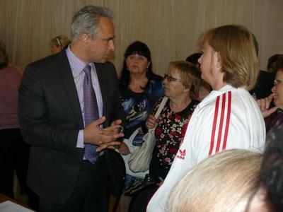 На снимках: на шахтерском собрании; депутат Евгений Бессонов отвечает на вопросы.