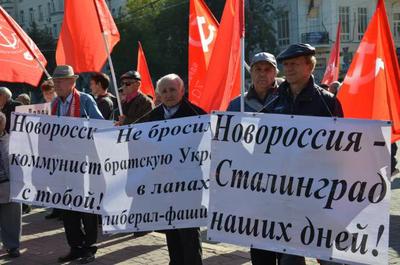 Митинг не случайно проходил не на Театральной площади, а возле памятника В.И. Ленину. Ведь памятники Владимиру Ильичу в связи с происходящими на Украине событиями приобрели особый смысл в идеологической борьбе с современным, поднявшим голову на «питательной среде» кризиса капитализма 21 века, фашизмом. И в выступлениях, звучавших на митинге, и на плакатах, которые держали его участники, тема борьбы с фашизмом и империализмом, тема пролетарской солидарности проходила красной нитью: «Новороссия – Сталинград наших дней!», «Капиталы олигархов замешаны на крови защитников Конституции», «Не бросим братскую Украину в лапах либерал-фашистов», «Новороссия, коммунисты с тобой», «Долой либералов из правительства».