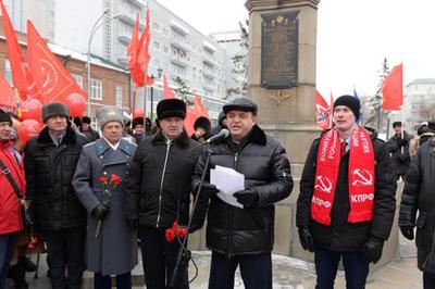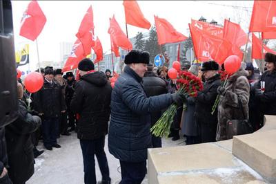 Новосибирский областной комитет КПРФ в честь 100-летия Красной армии организовал торжественное шествие и митинг возле бюста маршала Покрышкина.