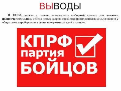 8) КПРФ должна и дальше использовать выборный процесс для накачки политических мышц, отбора новых кадров, отработки новых каналов коммуникации с обществом, апробирования своих программных идей и тезисов.