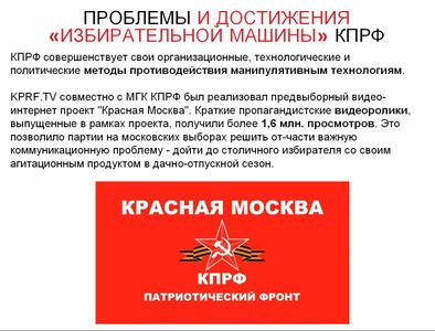 Например, впервые KPRF.TV совместно с МГК КПРФ реализовали предвыборный интернет-проект «Красная Москва». Краткие пропагандистские видеоролики, выпущенные в рамках проекта, получили более 1,6 млн просмотров. Это позволило партии на московских выборах отчасти решить важную коммуникационную проблему – дойти до столичного избирателя со своим агитационным продуктом в дачно-отпускной сезон.