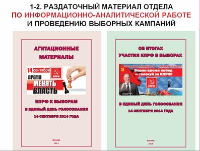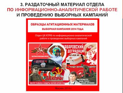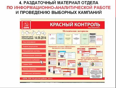 В частности, отработана система мониторинга предвыборного и политического телерадиоэфира, что позволило отделам ЦК активизировать работу по генерированию федеральных информационных поводов для СМИ. Была создана и опробована система индикативно-рейтинговых показателей, включая оперативный мониторинг присутствия кандидатов КПРФ и региональных отделений в медийном пространстве, что позволило Центральному штабу быстро реагировать на острые ситуации в ходе региональных кампаний. Наращивается работа по информационно-пропагандистской поддержке региональных кампаний через различные интернет-ресурсы, в т.ч. через сайты KPRF.ru, KPRF.TV, интернет-сообщество КПРФ, группы поддержки КПРФ в соцсетях.