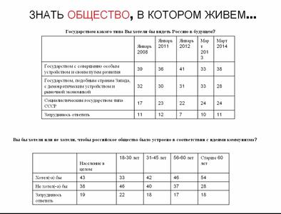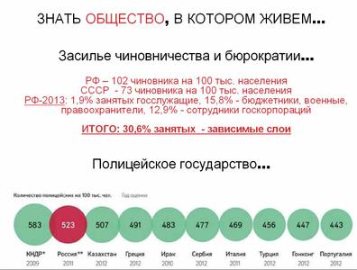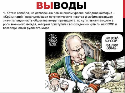 В политической жизни страны в чистом виде реализуется бонапартистский сценарий, когда нарастание внутриполитических противоречий купируется с помощью внешнеполитической экспансии. В русской истории уже были такие всплески в 1904 и 1914 гг., когда невиданный авторитет императора и всплеск патриотических чувств граждан после военных неудач обернулся против недавнего кумира. Естественно, анализ и прогноз развития ситуации вокруг Новороссии, Крыма, последствий санкций для дестабилизации внутриполитической ситуации не входит в задачи данного доклада.