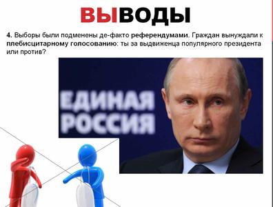 «Военный вождь» ассоциировался с партией власти и назначенными им губернаторами. Его выбор через все каналы коммуникаций одобрялся и не подвергался сомнению. Вместо реализации истинной задачи выборов – плановой ротации элит через суд избирателей в их интересах – всё происходило наоборот. Опять выборы были подменены де-факто референдумами. Граждан вынуждали к плебисцитарному голосованию: ты за выдвиженца популярного президента или против?