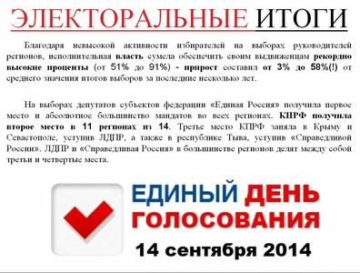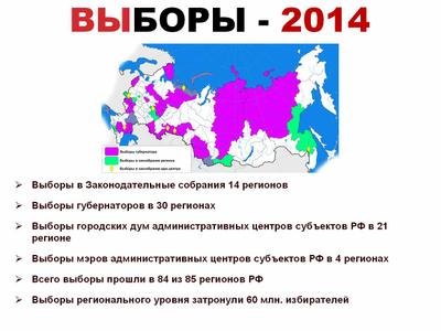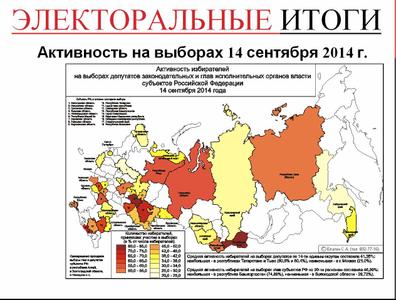 1) Общефедеральная региональная кампания 14 сентября проходила в условиях, когда страна ощутила на себе дыхание близкой войны, реальные санкции и нарастание вооруженных конфликтов по всему периметру нашей границы. Хотя и ослабла, но осталась на повышенном уровне победная эйфория «Крым наш!», всколыхнувшая патриотические чувства и мобилизовавшая значительную часть общества вокруг президента, по сути, выступающего в роли военного вождя, который приступил к возрождению чуть ли не СССР и воссоединению русского мира.