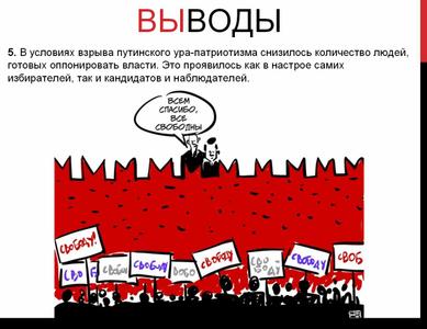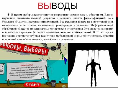 6) В целом выборы демонстрируют возросшую управляемость обществом. Власти научились выжимать нужный результат с меньшим числом фальсификаций, но с большим объёмом массовых манипуляций. Все решается теперь не в последний день голосования, а на этапах выдвижения, регистрации и агитации. Информационной обработкой общества из электорального процесса исключается большинство активных и протестных граждан (в людях вызывают апатию и абсентеизм). В то же время постоянно совершенствуются технологии мобилизации лояльного электората, который при низкой явке обеспечивает нужный власти результат.