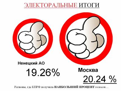 4) Наибольшую поддержку избирателей КПРФ получила в Москве (Общий результат одномандатников КПРФ – 20,24 против 13,30) и в Ненецком автономном округе (19,26%), хотя по сравнению с прошлыми выборами в НАО этот результат несколько снизился.