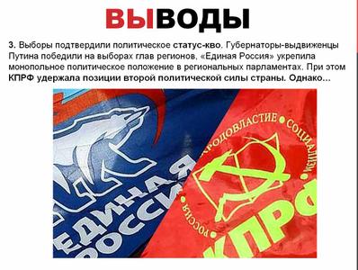3) Выборы подтвердили политический статус-кво. Губернаторы-выдвиженцы Путина победили на выборах глав регионов, «Единая Россия» укрепила монопольное политическое положение в региональных парламентах. А КПРФ удержала позиции второй политической силы страны. Программа нашей партии и наших кандидатов на прошедших выборах получили довольно широкую поддержку избирателей.