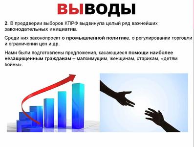 2) В преддверии выборов КПРФ выдвинула целый ряд важнейших законодательных инициатив. Среди них законопроект о промышленной политике, о регулировании торговли, об ограничении цен, о поддержке малого и среднего бизнеса. Нами были подготовлены предложения, касающиеся помощи наиболее незащищенным гражданам: малоимущим, женщинам, старикам, «детям войны». Была представлена и внешнеполитическая программа «Пять пунктов Зюганова по Новороссии». Она была материализована в активные и массовые действия по сбору гуманитарной помощи и крупные акции солидарности. Партия добивалась, чтобы в ходе избирательной кампании по всем этим темам состоялась полноценная дискуссия, но её навязать, в целом, не удалось.