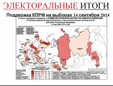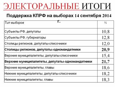 Средняя доля голосов, поданных за КПРФ по партийным спискам на муниципальных выборах нижнего уровня 14 сентября 2014 года, составила 18,2%. Для сравнения: в октябре 2012 года соответственный средний процент достигал 26,3%, в сентябре 2013 года – 22,5%.