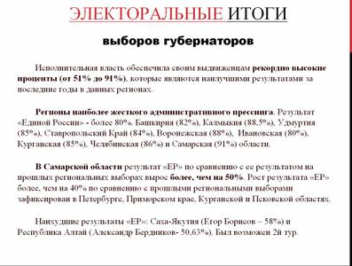 1) Во всех 30 субъектах Российской Федерации и.о. руководителей регионов получили наибольшую степень поддержки активных избирателей и были избраны на свои посты. Благодаря невысокой активности избирателей на выборах руководителей регионов, исполнительная власть сумела обеспечить своим выдвиженцам рекордно высокие проценты (от 51% до 91%), которые являются наилучшими результатами за последние годы в данных регионах. Результат и.о. руководителей субъектов РФ, в основном представляющих партию «Единая Россия» (за исключением Орловской и Кировской областей), существенно вырос в сравнении с предыдущими региональными и даже федеральными выборными кампаниями. В большинстве этих регионов прирост составил от 3% до 58%(!) от среднего значения итогов выборов за последние несколько лет).