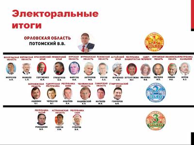 Член ЦК КПРФ В.В.Потомский, баллотировавшийся на пост губернатора Орловской области как и.о., назначенный президентом, честно, открыто и образцово провёл выборы, получив при явке в две трети избирателей около 90% поддержки.