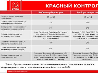 1) В рамках совершенствования технологий «управляемого голосования» партия власти отрабатывает масштабные меры по корректировке волеизъявления граждан. К сожалению, КПРФ против некоторых манипулятивных технологий власти до сих пор не нашла противоядия.