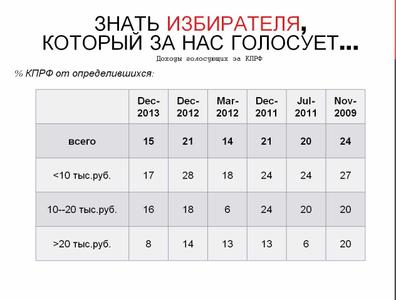 10) Средний количество голосов, отданных за компартию на выборах в парламенты региональных столиц, составило 12%. Для сравнения: в марте 2012 г. – 23%, в октябре 2012 г. – 17%, в сентябре 2013 г. – 13%.