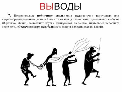 Показательные публичные увольнения недостаточно послушных или сверхкоррумпированных деятелей по итогам или до возможных провальных выборов (Юрченко, Денин) заставляют других единороссов на местах тщательнее исполнять свою роль, обеспечивая ауру непобедимости вокруг находящихся во власти.