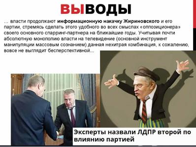 Весь 2014 год, начиная с января, телеканалы поддерживают на высоком уровне интерес к либерал-демократам. Даже в месяц агитации ЛДПР получает 34% эфира. Создаётся впечатление, что телеканалы старательно «коллекционируют» информационные поводы, предоставленные ЛДПР, и оттягивают на неё внимание избирателей.