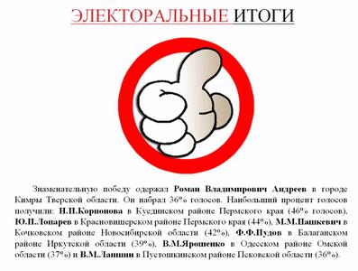 Знаменательную победу одержал Роман Владимирович Андреев в городе Кимры Тверской области. Он набрал 36% голосов. Наибольший процент голосов получили: Н.И.Корионова в Куединском районе Пермского края (46% голосов), Ю.П.Лопарев в Красновишерском районе Пермского края (44%), М.М.Пашкевич в Кочковском районе Новосибирской области (42%), Ф.Ф.Пудов в Балаганском районе Иркутской области (39%), В.М.Ярошенко в Одесском районе Омской области (37%) и В.М.Лапшин в Пустошкинском районе Псковской области (36%).