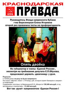 Притчей во языцех стала глава кубанского Фонда капремонта гр. Березницкая. Она дважды провалилась в Москве в министерстве при обязательном тестирование на профпригодность. И этой даме доверили народные средства на 1 млрд. руб. Написал губернаторузапрос - гоните в шею такого "специалиста". Но видимо у нее какая та "лапа",что губернатор эту "неумеху" продолжает держать на миллиарде средств на капремонт. Кстати, на содержание конторы гр Березницкой потрачено почти полторы сотни миллионов рублей, в том числе на авто и офиисную технику - свыше 20 млн. руб.