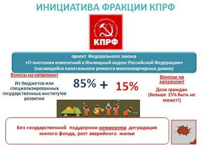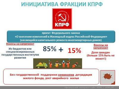 От KPRF.RU: Законопроект фракции КПРФ полностью видоизменяет действующий порядок организации капремонта, по которому все расходы государство перекладывает на жильцов, но при этом не несет никакой ответственности ни за сроки. ни за качество, ни за перечень работ. Новый законопроект фракции КПРФ призван устранить эту несправедливость и безответственность государства перед гражданами.