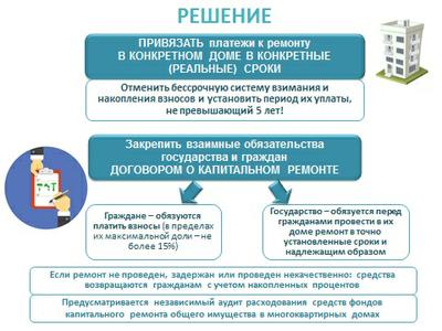 Как сообщил в прямом эфире радиостанции «Говорит Москва» депутат Госдумы Сергей Обухов, сроки выплат взносов и их размер предлагается строго ограничить. «85% должно компенсировать государство. Государство заключает договор о том, что в ближайшие пять лет будет ремонт. Мы, государство, гарантируем такую-то сумму. А вы, жильцы, должны собрать эти 15% на конкретные виды работ», - отметил Обухов. Таким образом, коммунисты предлагают оплачивать только тот ремонт, который власти гарантируют в течение пяти лет.
