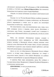 В соответствии со ст. ст. 7, 14 Федерального закона «О статусе члена Совета Федерации и статусе депутата Государственной Думы Федерального Собрания Российской Федерации», направляю в Ваш адрес для проведения проверочных мероприятий в соответствии с требованиями действующего законодательства РФ публикацию в СМИ «КОМПАНИЯ» № 28/856 от 27.07.2015 года «Обещал. Избрался. Забыл. Как изменилось Подмосковье после прихода к власти Андрея Воробьёва».