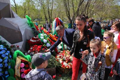 Михаил Калакин. На фото: Игорь Чунчель с комсомольцами и молодыми саяногорцами возлагает цветы к восстановленному монументу 9 мая