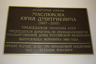 1 октября 2013 г. в Балтийском государственном техническом университете «ВОЕНМЕХ» имени Д. Ф. Устинова состоялось торжественное открытие именной аудитории Юрия Дмитриевича Маслюкова – выпускника Военмеха 1962 г., заместителя министра оборонной промышленности, первого заместителя председателя Совета Министров СССР – председателя Госплана СССР, председателя Военно-промышленной комиссии при Совете Министров СССР, председателя Комитета по промышленности Государственной думы Российской Федерации.
