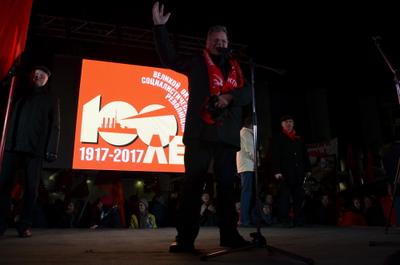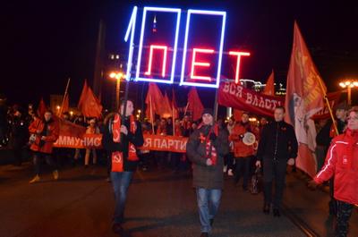 В мероприятиях Санкт-Петербургского отделения КПРФ приняли участие десятки левых организаций со всего мира: под красными знаменами прошли представители коммунистических и рабочих партий из Германии, Непала, Палестины, Шри-Ланки, Швеции, Италии, Финляндии, Турции и других государств. Возглавляли праздничную колонну комсомольцы Санкт-Петербургского отделения ЛКСМ РФ. К подготовке мероприятия комсомольцы подошли творчески: дополнительную красочность шествию добавляла большая светящаяся надпись «100 лет», символизирующая юбилейную дату Великого Октября и члены ВПК «Комсомолец», одетые в форму революционных солдат и матросов. Под лозунгами «Ленин! Партия! Комсомол!», «Революция, «Аврора» - нет пути у нас другого!», «Красные в городе!», «Вся власть Советам!», «Комсомол, смелее будь - нам не нужен старый путь!» многотысячная колонна прошла до легендарного крейсера «Аврора», где состоялся грандиозный праздничный митинг.