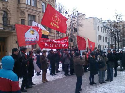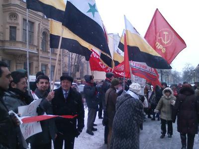 Да, коммунисты в современном мире, как провидчески отметил Иосиф Виссарионович Сталин, действительно подняли знамя национально-освободительной борьбы. Именно поэтому к представительству реальной империи зла вышли коммунисты Центрального, Приморского, Московского и Красногвардейского райкомов Петербурга, а вместе с ними - активисты Санкт-Петербургского отделения ВСД "Русский Лад", включая входящих в "Русский Лад" членов Российско-Белорусского братства и Славянского вече. К ним с благодарностью присоединились живущие в городе на Неве сирийцы.