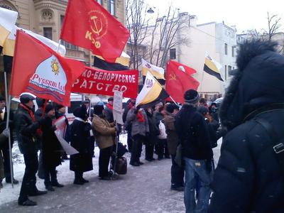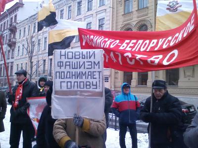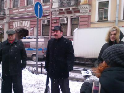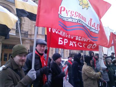 В заключение пикета к присутствующим обратился руководитель сектора по информационно-аналитической работе Петербургкого отделения ВСД "Русский Лад", эксперт Центра внутриполитических проблем Максим Михайлович Лагутин. Он напомнил присутствующим о концепции "петли анаконды", принятой в свое время еще странами Антанты, которые пытались задушить Советскую Россию. Эта концепция реализуется и сейчас, подчеркнул Максим Лагутин. Если мы не будем бороться сообща, то нас задушат.
