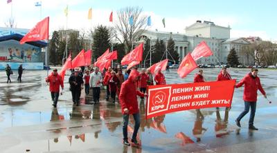Праздничная колонна, которая двигалась от Вечного огня у памятника Борцам социалистической революции 1917 года, что в сквере театра оперы и балета им. Н.Г. Чернышевского, к центральному памятнику В.И. Ленину на площади Революции, была украшена множеством алых флагов КПРФ и ярким транспарантом, на котором было начертано: «Ленин жил! Ленин жив! Ленин будет жить!».