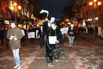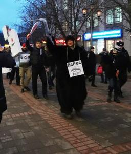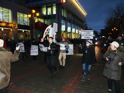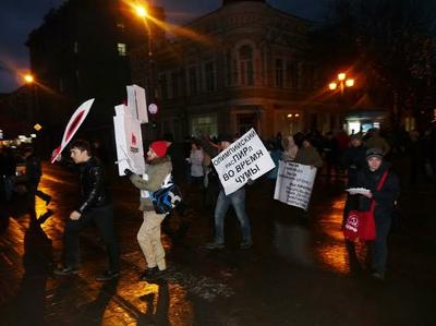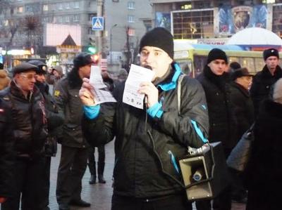 Там, на сборном пункте у Крытого рынка, почти все уже были готовы к запланированному театральному шествию, и они только дожидались нас (что за акция без наглядной агитации!). Мы быстренько раздали агитматериалы и двинулись было с места, но нас тут же остановила полиция и, не торопясь, основательно стала проверять наши «разрешительные» документы, что-то там ещё и ещё… Видно было, что они придираются к нам намеренно, чтобы если уж не сорвать, то хотя бы сделать акцию как можно короче (по времени). Лишь после того, как наш лидер - первый секретарь горкома КПРФ А.Ю. Анидалов возмутился: вы нам срываете акцию, нарушаете права человека, мы двинулись по проспекту Кирова по маршруту «Детский мир» — Консерватория.