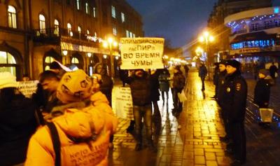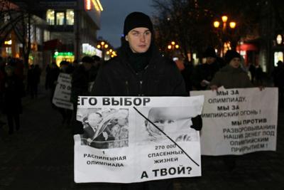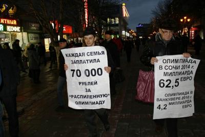 Активисты КПРФ прошли по проспекту Кирова от Крытого рынка до Консерватории. На протяжении всего маршрута акции протеста первый секретарь горкома КПРФ Александр Анидалов рассказывал горожанам, что на Олимпиаду в Сочи было затрачено в 10 раз больше денежных средств, чем на Олимпиаду в Ванкувере, и что можно было бы сделать на деньги, «распиленные» при проведении Олимпиады в Сочи: «Денег хватило бы, чтобы полностью перевооружить ВВС и ПВО страны! Сейчас у нас могут подняться в воздух только 250 боевых самолетов. За эти деньги мы могли бы тысячу сверхсовременных самолетов поставить на вооружение! 1/6 части потраченных денег хватило бы на то, чтобы полностью решить проблему нехватки детских садов в стране. Практически каждой российской семье Олимпиада обошлась в 70 000 рублей!».