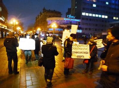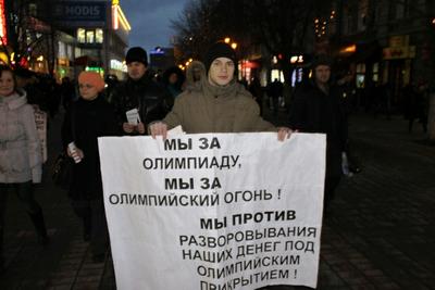 Другие участники шествия несли плакаты. На них было написано: «Каждая семья заплатила за «распиленную» Олимпиаду 70 тысяч рублей», «Распил, скоростной откат — сочинские виды спорта», «Мы за Олимпиаду! Мы за Олимпийский огонь! Мы против разворовывания наших денег под олимпийским прикрытием!» и др.