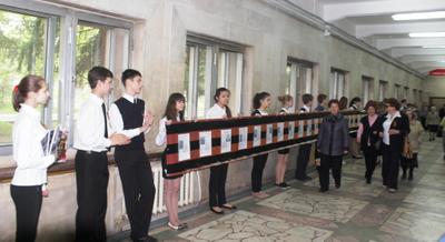 В фойе зала оркестр исполнял песни военных лет, а школьники держали в руках памятную ленту с портретами героев войны, и встречали входящих ветеранов благодарными овациями.